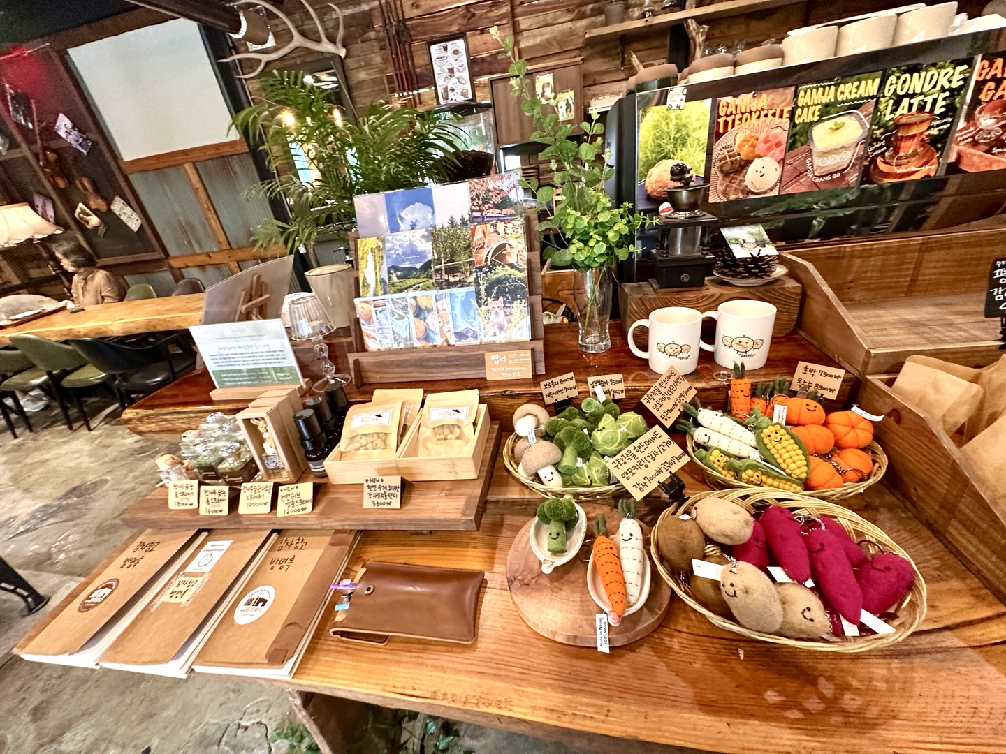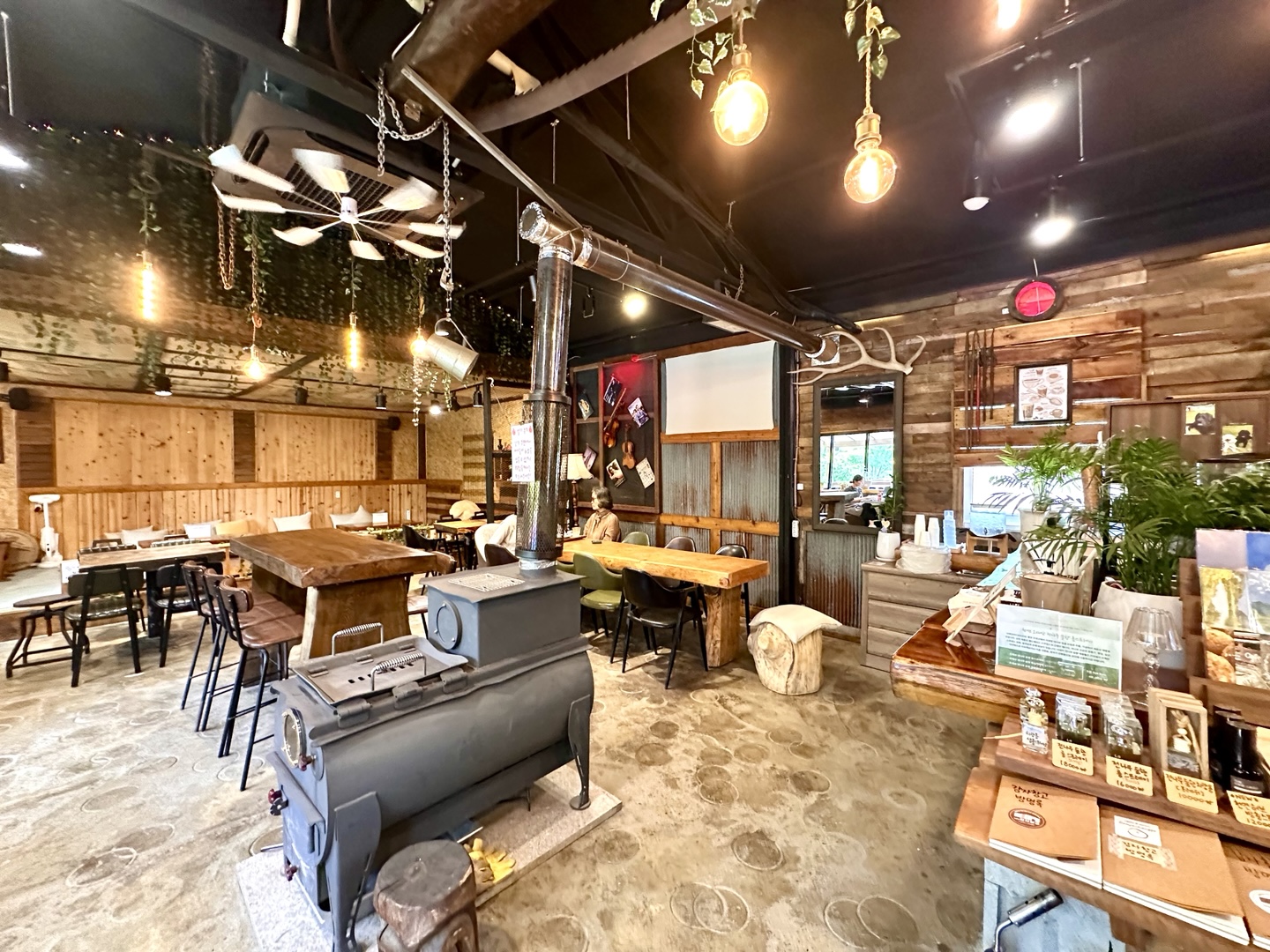 전면 통창으로 탁 트인 개방감을 느낄 수 있어 마치 숲속에 온 듯한 분위기예요. 내부는 시골 창고 같은 따뜻하고 아늑한 인테리어로 꾸며져 있어, 감성적인 평창 카페를 찾는 분들께도 추천해요.